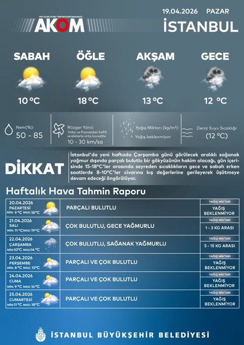 İstanbul Büyükşehir Belediyesi (İBB) Afet Koordinasyon Merkezi (AKOM), kentin önümüzdeki bir haftalık hava durumuna ilişkin tahmin raporunu paylaştı. Rapora göre